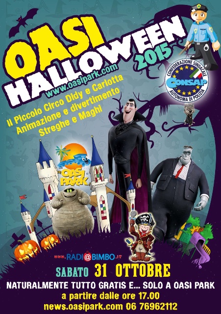 Appuntamento per tutti bambini e famiglie sabato 31 ottobre 2015 dalle ore 17.00 all’Oasi Park (Via Tarquinio Collatino 56/58 Roma) per festeggiare la ricorrenza “dei brividi amici” con il Piccolo Circo degli Orrori divertenti di Diddy e Carlotta, artisti, trampolieri, mangiafuoco, fantastici clown con il coinvolgimento dei bambini presenti all’interno del parco vestito per l’occasione con zucche, ragnatele, streghe e incantesimi, personaggi di Hotel Transilvania.