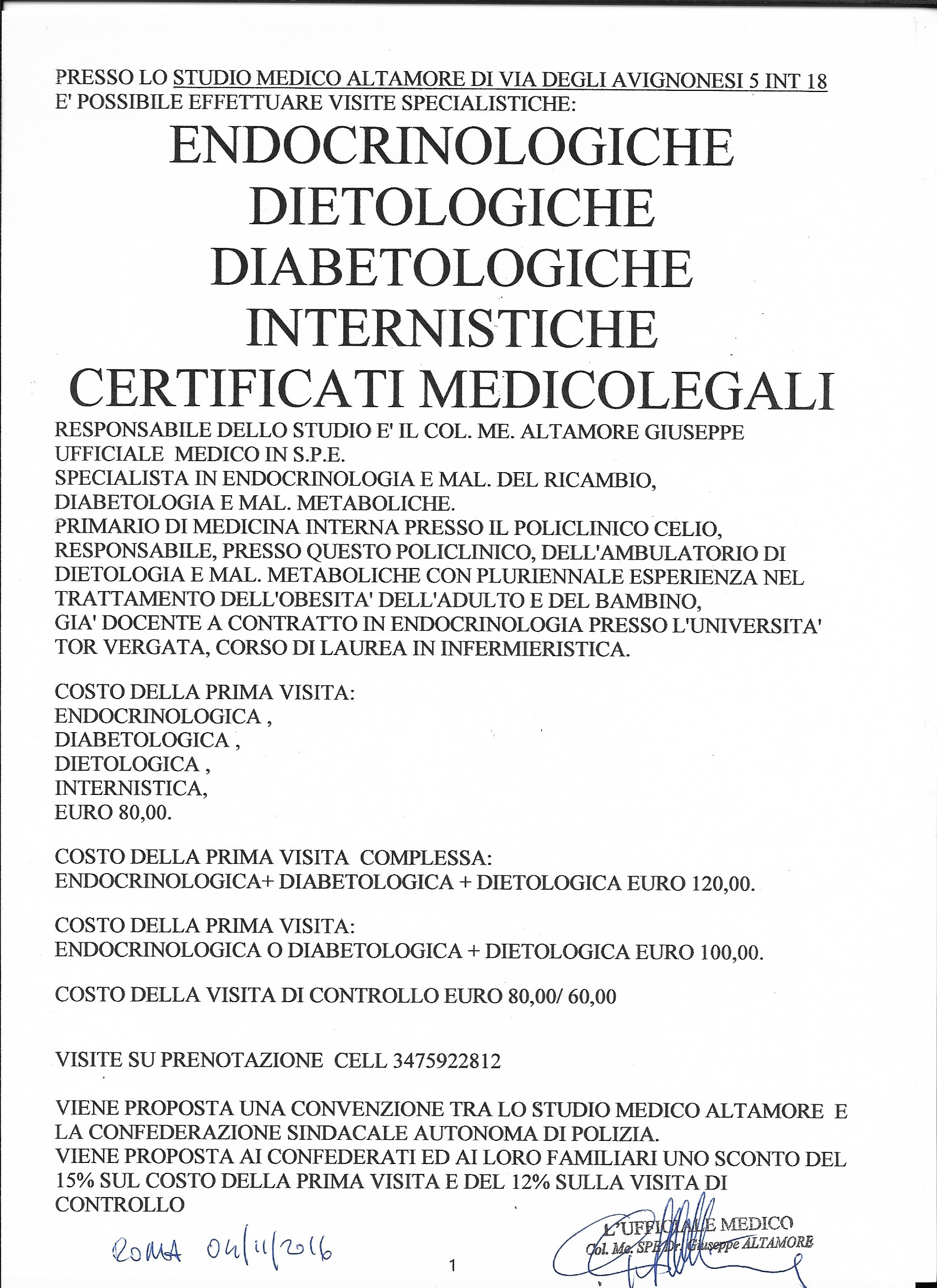 il Prof. Giuseppe Altamore (Primario di Medicina Interna in qualità di Capo dell’ Unità Operativa Complessa, Responsabile dell’ambulatorio di Dietologia e Malattie Metaboliche – Policlinico Militare Celio)