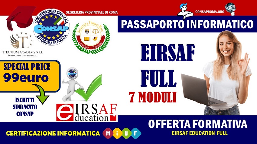 PASSAPORTO INFORMATICO EIRSAF FULL (7moduli): offerta formativa TITANIUM ACADEMY al prezzo speciale per gli iscritti alla CONSAP (#consaproma)