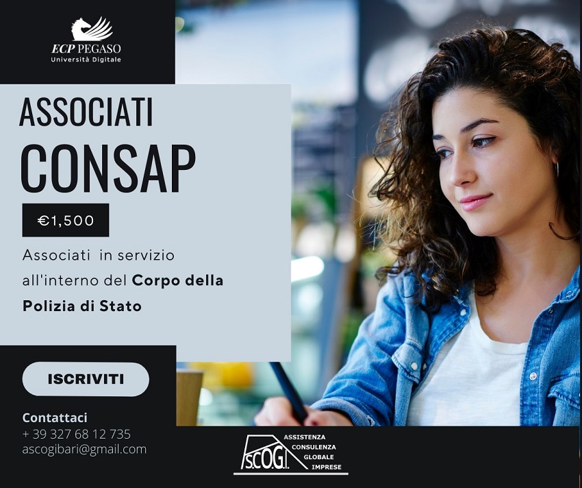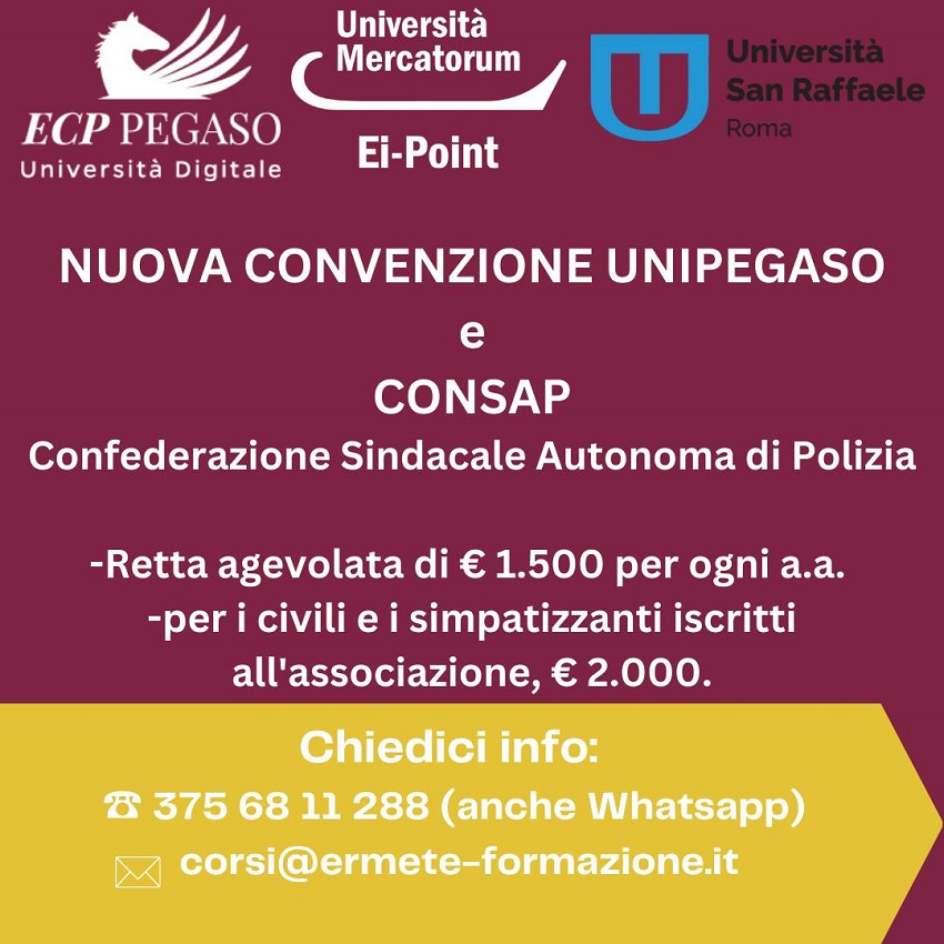 Rinnovata la convenzione tra la CONSAP – Confederazione Sindacale Autonoma di Polizia e l’Università Telematica Pegaso che concede agli studenti indicati da CONSAP ed inquadrati nella Polizia di Stato in servizio permanente, una retta in convenzione per l’ iscrizione ai Corsi di Laurea pari a € 1.500 per ogni anno accademico, anziché € 3.000, da corrispondere in 4 rate secondo la previsione indicata all’atto dell’iscrizione sul sito internet dell’Ateneo al seguente indirizzo web www.unipegaso.it.