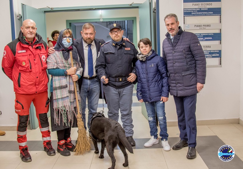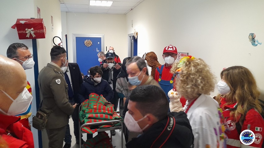 Partenza da Monteverde (un particolare ringraziamento al Signor Questore di Roma per la gentile e preziosa collaborazione, mettendo a disposizione equipaggio in uniforme del locale Comm.to e il Reparto Cinofili della stessa Questura romana) direzione ospedale San Camillo/Forlanini di Roma, per far visita ai bambini ricoverati (Reparto Pediatria – Pronto Soccorso Pediatrico), dove, insieme al cinofili della Polizia di Stato e al personale della Croce Rossa Italiana (volontari e clown dottori) sono state consegnate calze, giocattoli e dolciumi, abbinati a brevissimi spettacoli di corsia.