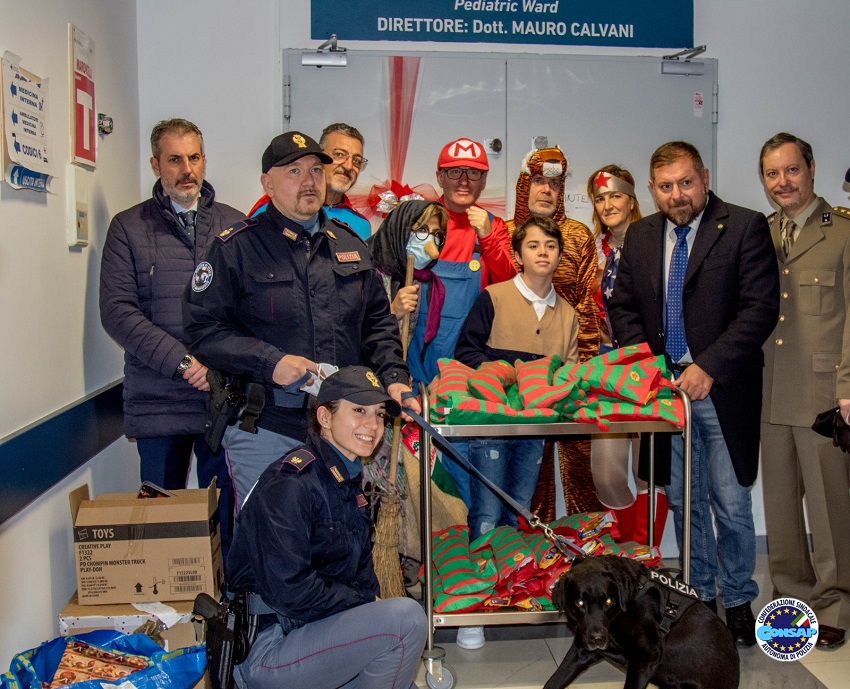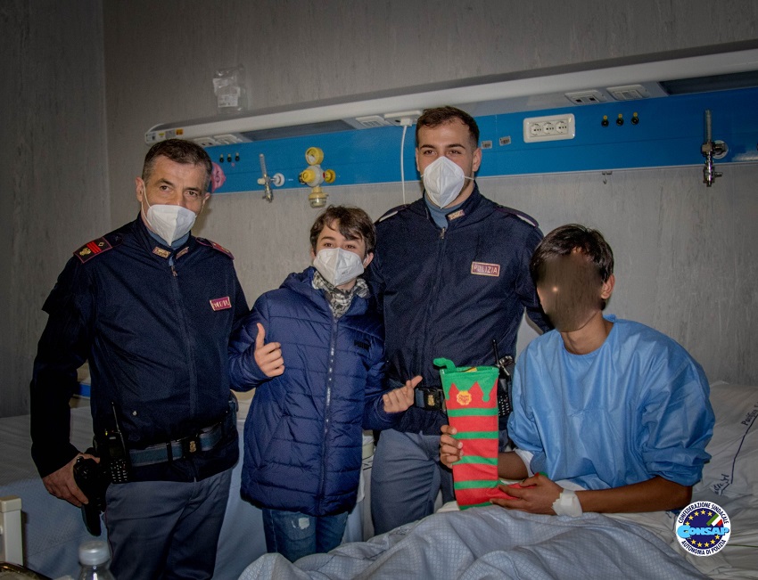 I poliziotti della CONSAP al San Camillo donano calze e dolci con Federico Ielapi