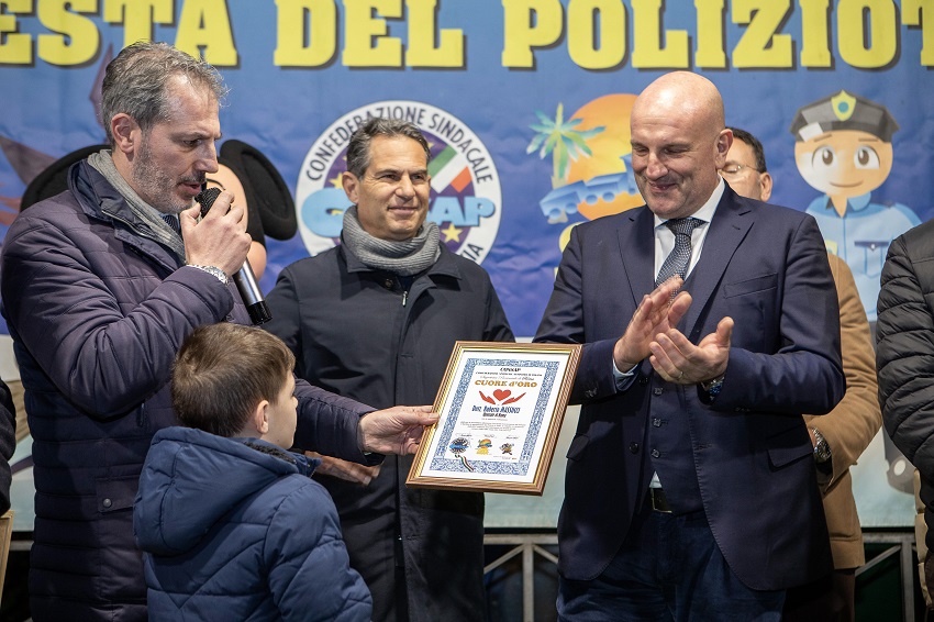 Graditissima la presenza e il saluto ai bambini e famiglie del Signor Questore di Roma dott. Roberto Massucci al quale la Segreteria Provinciale di Roma della CONSAP ha voluto conferire la distinzione di merito “Cuore d’Oro” e il titolo di “Ambasciatore della Legalità” in collaborazione con l’Associazione ARGOS Forze di POLIZIA. Toccante alla presenza del Questore dott. Massucci l’ascolto dell’inno nazionale alla presenza del pubblico, suonato dal fisarmonicista marsicano Maestro Prof. Danilo Murzilli, con la presenza sul palco del Segretario Generale Nazionale Patrizio Del Bon, del Presidente Alberto Catalano, del Segretario Generale Nazionale Vicario Sergio Conte, del Capo Ufficio Stampa giornalista Massimo D’Anastasio tutti al vertice del sindacato CONSAP.