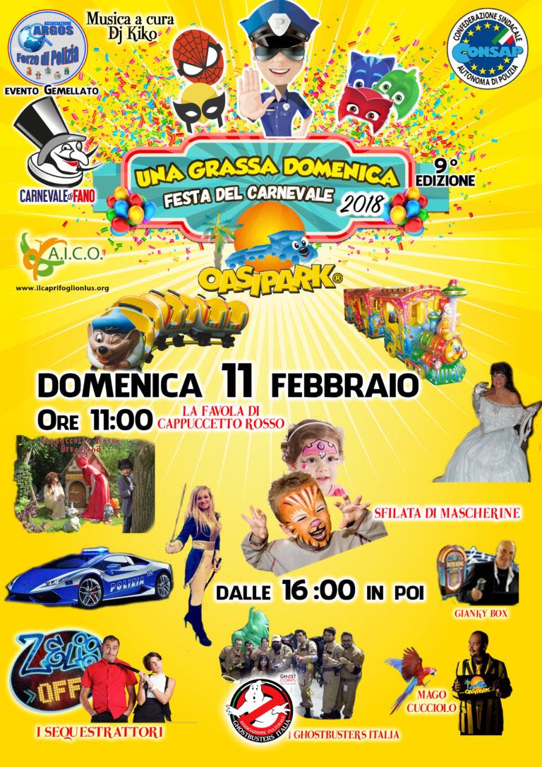 Domenica 11 Febbraio 2018, a partire dalle ore 15.00, all’Oasi Park, la CONSAP festeggia la nona edizione di Una Grassa Domenica Festa del Carnevale, kermesse dedicata a tutti i bambini e rispettive famiglie con spettacoli a tema carnevale. Tanti gli ospiti e programma ricco per un pomeriggio tutta da vivere tra coriandoli, musica, baby dance, maschere e allegria.