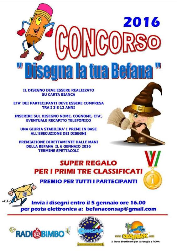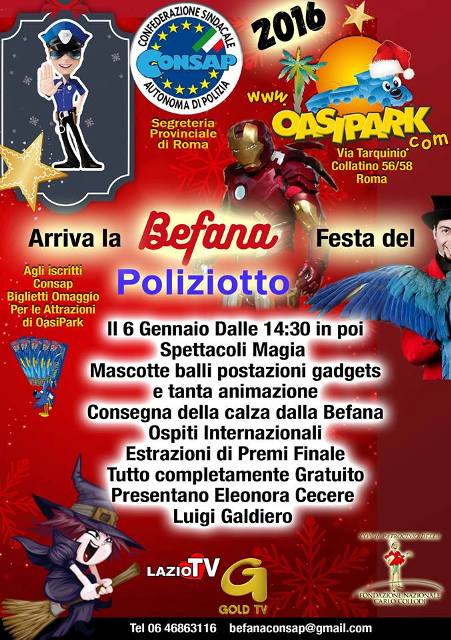 Anche quest’anno si rinnova il tradizionale appuntamento romano per festeggiare l’arrivo della Befana. Festa a tema per bambini organizzata dal sindacato della Polizia di Stato CONSAP di Roma guidato dal Segretario Generale Aggiunto Gianluca Guerrisi, tanti ospiti vip del cinema, teatro e televisione, giochi, magie, mascotte e consegne delle calze dalle mani della vera befana e con il gran finale della baby pesca a premi con regali di assoluto rilevo donati da aziende leader nel settore del commercio e dal grande cuore e generosità.